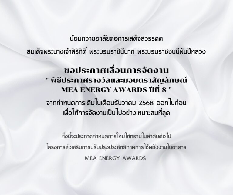 เพื่อน้อมถวายอาลัยต่อการเสด็จสวรรคต สมเด็จพระนางเจ้าสิริกิติ์ พระบรมราชินีนาถ พระบรมราชชนนีพันปีหลวง ทางโครงการฯ จึงขอประกาศเลื่อนการจัดงาน ” พิธีประกาศรางวัลและมอบตราสัญลักษณ์ MEA ENERGY AWARDS ปีที่ 8 “จากกำหนดการเดิมในเดือนธันวาคม 2568 ออกไปก่อน เพื่อให้การจัดงานเป็นไปอย่างเหมาะสมที่สุด ทั้งนี้โครงการฯ จะประกาศกำหนดการใหม่ให้ทราบในลำดับต่อไป รายละเอียดการสมัครเข้าร่วมโครงการฯ ดาวน์โหลดใบสมัครเข้าร่วมโคงการฯ