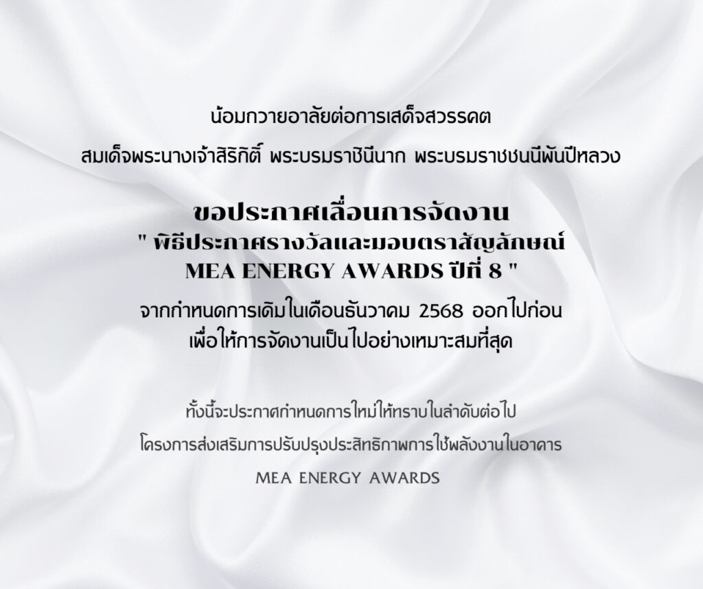 เลื่อนพิธีประกาศรางวัลและมอบตราสัญลักษณ์ MEA ENERGY AWARDS ปีที่ 8