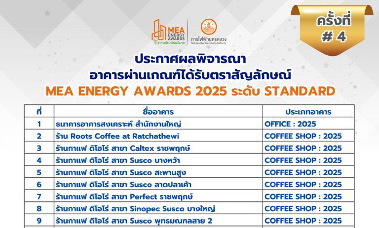 🌱😁⭐️ประกาศผลพิจารณาอาคารผ่านเกณฑ์ได้รับตราสัญลักษณ์MEA ENERGY AWARDS 2025 ระดับ STANDARD # ครั้งที่ 4จำนวน 65 อาคาร ดังนี้  ธนาคารอาคารสงเคราะห์ สำนักงานใหญ่  ร้าน Roots Coffee at Ratchathewi  ร้านกาแฟ ดิโอโร่ สาขา Caltex ราชพฤกษ์  ร้านกาแฟ ดิโอโร่ สาขา Susco บางหว้า  ร้านกาแฟ ดิโอโร่ สาขา Susco สะพานสูง  ร้านกาแฟ ดิโอโร่ สาขา Susco ลาดปลาเค้า  ร้านกาแฟ…